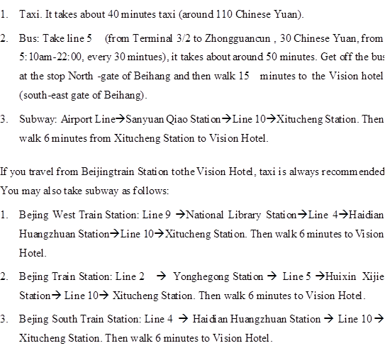 If  you plan to travel from PEK airport (http://www.bcia.com.cn)  to Vision Hotel/Beihang University, you can choose one of the following  options: