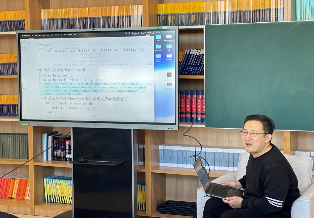 “对于数学未来发展,具有决定性影响的一个不可估量的方面是计算机对数学带来的冲击,在不久的将来,电子计算机之于数学家将与显微镜之于生物学家、望远镜之于天文学家那样不可或缺。”以吴文俊先生的观点为引,牟晨琪讲解了计算机工具对于数学研究中的推动作用,并以“多项式方程组求解初探”的讨为例,带同学们初步领略了“几何定理机器证明”的巧妙。