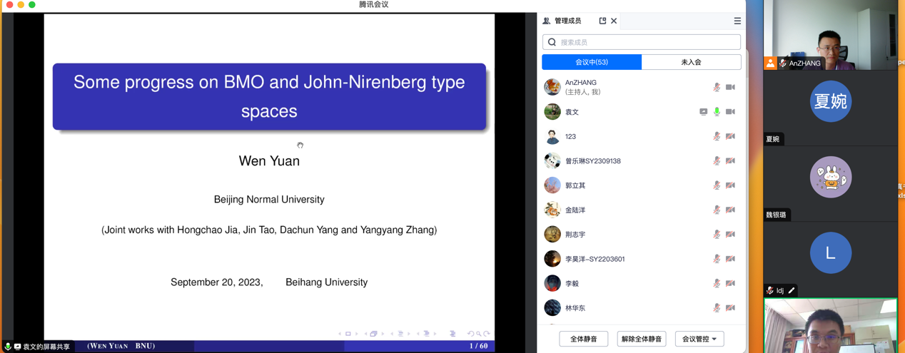 2023年09月20日,北京师范大学袁文教授,应邀为网投十大信誉可靠平台师生做了题为 “Some progress on BMO and John- Nirenberg type spaces”的学术报告。报告由张安老师主持。