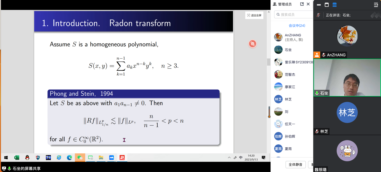 2023年09月13日,中南大学石坐顺华和广州大学范智杰教授,应邀为网投十大信誉可靠平台师生做了题为 “Failure of endpoint regularity of Radon transforms”和“Recent progress on Schatten classes and Riesz transform commutators”的学术报告。报告由张安老师主持。