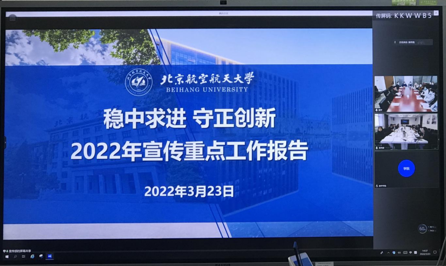 接着,宣传部副部长余敏做了《稳中求进 守正创新 2022年宣传重点工作报告》专题报告,介绍年度宣传工作的主线、主题、主责、主调,对全年宣传工作重点进行了详细解读。宣传部副部长孙也程做了《2022年度思想文化工作介绍》专题报告,介绍学校年度理论学习和严格落实意识形态工作责任制工作要求,解读了人文北航建设和校庆宣传工作整体安排。