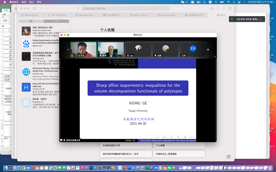 2021年4月30日上午,同济大学数学学院熊革教授受邀为网投十大信誉可靠平台师生做了题为“Sharp affine isoperimetric inequalities for the volume decomposition functionals of polytopes”的线上学术报告,报告由张世金老师主持。此报告为数学学院几何团队每周五上午讨论班的学术报告。