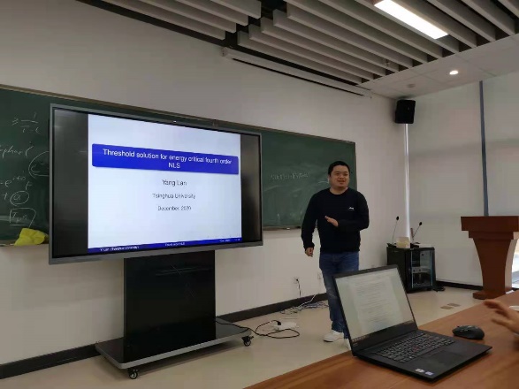 本次研讨会的研讨内容主要是调和分析和流体力学方程的相关问题的进展,六位青年学者分别介绍了各自在相关领域的最新进展。张安介绍了如何用流的方法来推导一些特殊不等式,特别是临界情况的不等式;范晨捷介绍了质量临界的非线性薛定谔方程的log-log爆破的动力学行为,并介绍了怎样用概率的方法来构造一类结构化的随机扰动;刘彦麟介绍了三维Navier-Stokes方程的只限制p3u0小的整体解的存在性;徐桂香介绍了小质量的导数非线性薛定谔方程的Schwartz解的微观守恒律,并利用该守恒律推导局部光滑性及在低正则性的整体解的存在性;邓雯介绍了两维只带竖直方向耗散的Boussinesq系统的Couette流问题的稳定性;兰洋介绍了聚焦性四阶非线性薛定谔方程的临界能量阈值解的动力学行为。