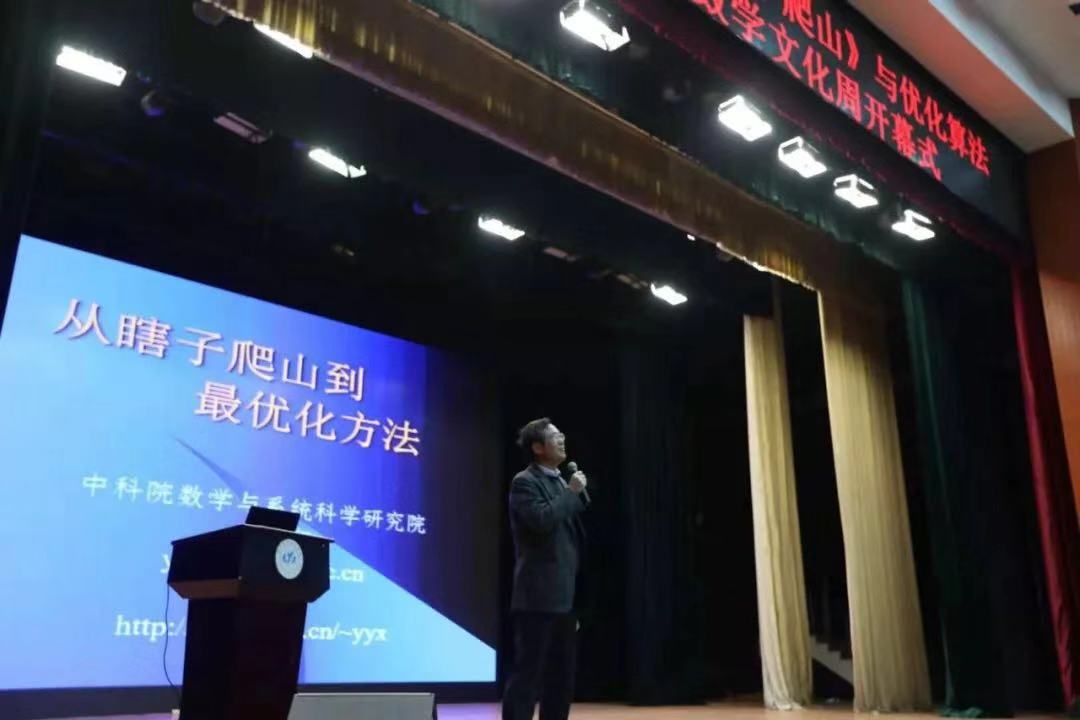 袁亚湘院士首先从我国著名数学家华罗庚先生命名的一个优化问题引入。什么是瞎子爬山?就是说当一个瞎子在爬山时,用明杖在四周试探,如果发现哪个方向可以往上走,就选择这个方向向上行走,停下后再按照这个步骤循环。当瞎子四周都不能上行时,就爬到了山的最高点。
