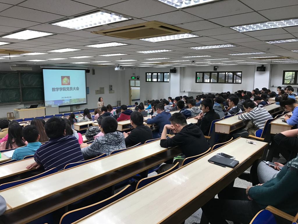 4月12日中午,数学与系统科学学院在主M101召开党员大会,全院近两百名党员参加了会议。党委书记李红捷向全体党员传达了学校2017年全面从严治党工作会议以及全校党支部书记大会两个会议的精神,与全体党员集体学习了张军书记在大会上的讲话。
