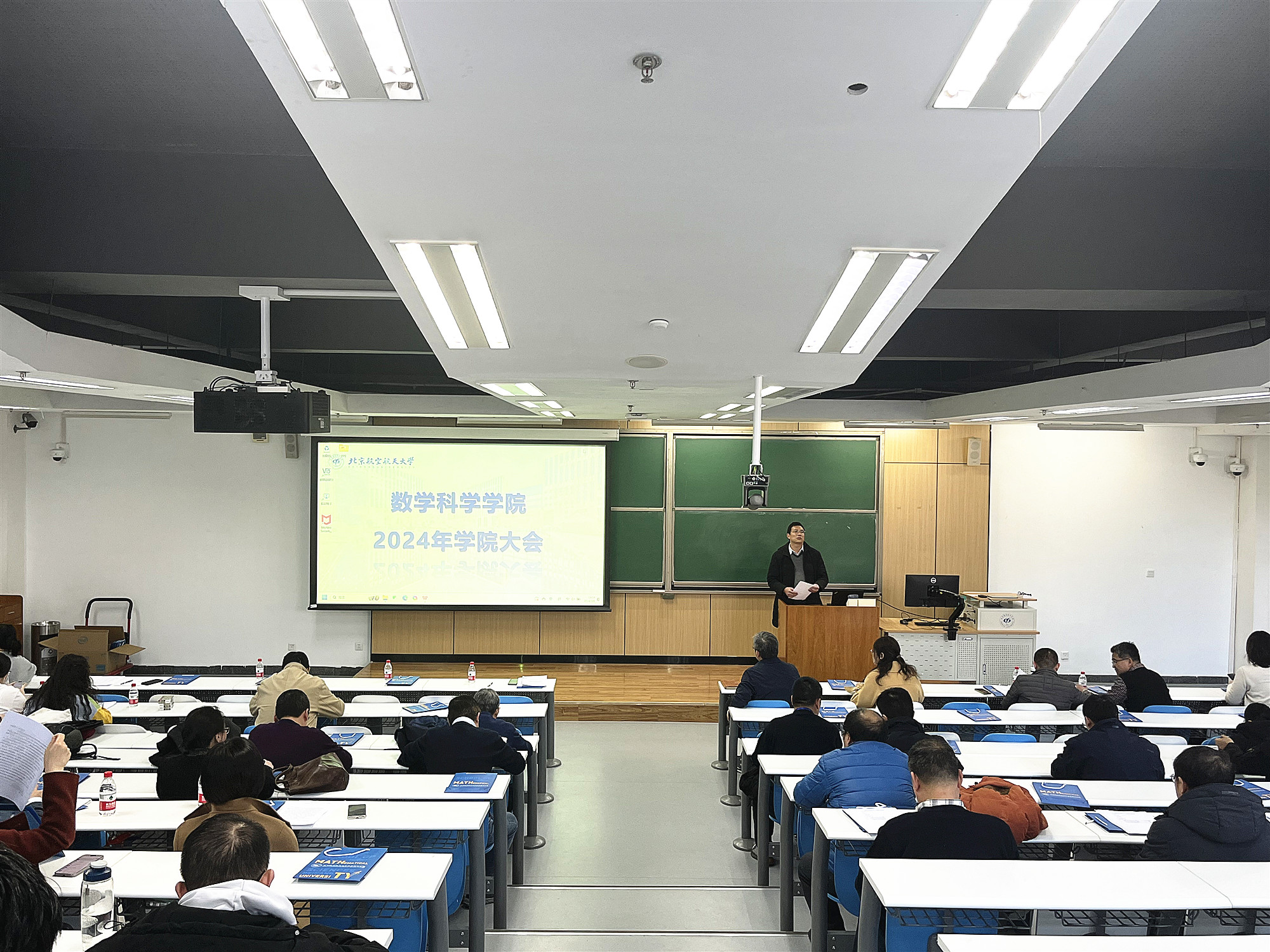 副院长马声明介绍了2024年本科教学工作要点,本科教学将以提升人才培养质量为重点,在课程质量提升、课程体系建设、教材规划、教学队伍建设和名师培育方面积极谋划多措并举,全方位推进制度建设和平台建设。副院长夏勇对学科和研究生年度重点工作进行了介绍,解读了学校研究生论文保障质量、全过程督导等研究生教育教学重点内容,并强调了本研贯通、学术教育改革等变化变革要求。副院长张筱介绍了科研年度工作重点,对承担重大重点任务、开展基础研究、国际科技合作、产出一流成果、学术影响力及社会服务等科研指标进行了细致深入说明,鼓励教师积极产出标志性成果。党委副书记魏茜从强化协同联动、涵育数学文化、打造优质平台三个方面阐释了推动学院学生思政工作高质量发展的思路举措,将强化价值塑造、深化学风建设、优化积极心理工作机制,全方位浸润数学文化,着力推进学生科创、实践、就业等工作质量提升,助力学生全面成长成才。