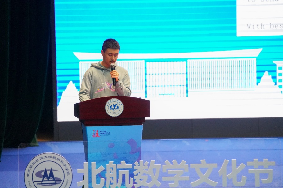 学生代表王钰荃在开幕式上发言。他分享了发现国外代数书籍中的错误并通过邮件与原作者交流的经历,鼓励同学们在学习的过程中要敢于质疑、勤于交流。