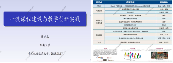 2025 年 1 月 17 日,东南大学陈建龙教授应线性代数课程组邀请出席数学名师讲座,为网投十大信誉可靠平台的师生们带来一场以《一流课程建设与教学创新实践》为题的精彩报告,数学科学学院六十余名师生聆听了陈教授的精彩报告。