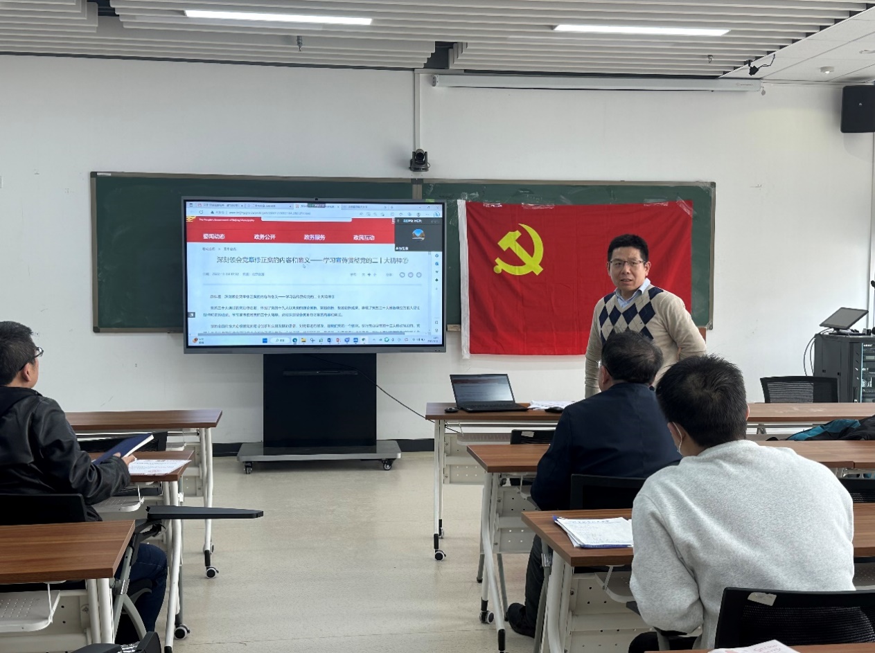 本次学习的主题是深刻领会党章修正案的内容和意义。支部书记孙玉泉同志带领全体党员学习了二十大党章修改的全部内容,并进一步强调党章是我们党的根本大法,是管党治党的总章程,党员应该深刻把握党章改、变与不改、不变的规律,把党章的明文规定和贯穿党章始终的原则、精神学深悟透,使之真正成为党员加强党性修养的根本标准,成为指导党的工作、党内活动、党的建设的根本依据。
